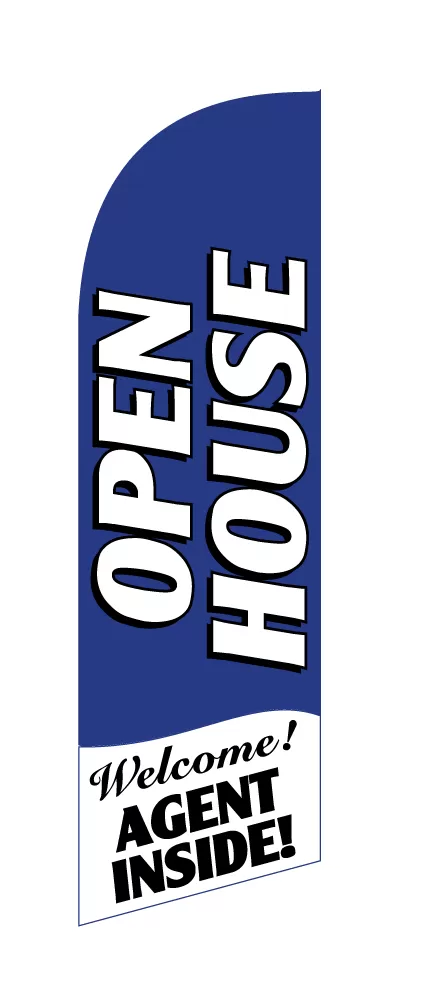 This feather flag, also called an advertising banner, has a vibrant colored background with bold graphics and text. Great for realtors and property managers! This flag measures approximately 2.5 feet wide by 6.5 feet tall. When installed on the flagpole it is nearly 8 feet tall. Constructed from UV treated, lightweight and affordable polyester. The printing on our flags is dyed-through so the message is visible from both sides. It has a sewn sleeve that easily slips over the specially designed flagpole that is included. This flag is sold as a complete kit which includes a flag, flagpole, and ground-spike. It can be set-up in less than 5 minutes without any tools. (if the ground is frozen or hard you may need a hammer to pound the ground-spike in) Purchase one of our feather banners today and get your property or open-house noticed!