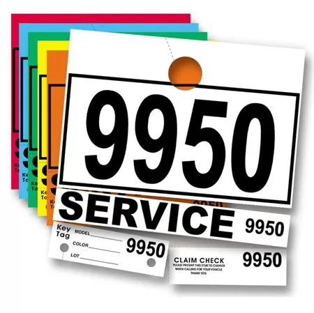 | Use this innovative system to control service department jobs. The top part of this tag hangs from the rearview mirror. Two consecutively numbered*, perforated, detachable tags at the bottom become the key tag and customer claim check. After service is complete, the technician removes the "SERVICE" portion from the hang tag and attaches it to the paperwork, signaling service completion. Sold in packs of 1000 tags. Enter starting number desired in the box above. *Initial number must be multiple of 1,000. Lowest set available is 0000-0999. Highest set available is 9000-9999 Available colors are: Blue, Brown Green, Grey, Lime Green, Orange, Pink, Purple, Red, White, Yellow |