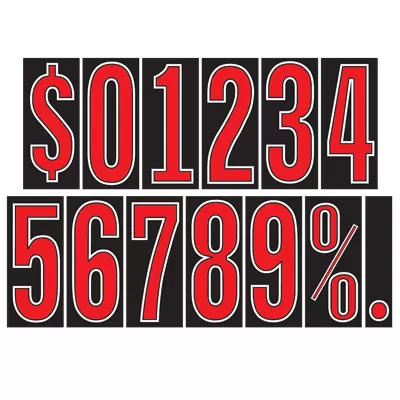 Bright Red, Black & White, adhesive windshield number. An inexpensive yet highly effective sales tool to advertise a year model or price. Sold by the dozen (12 per pack) of all the same number. These numbers are not sold in combo packs that contain an assortment of numbers. You must use the drop-down menu above to select and purchase separately, each number that you require. Size: 7 1/2" tall x 4" wide. Neatly shrink wrapped in packs of a dozen with a chipboard backer to prevent curling during storage. Made of durable, waterproof vinyl, these non-fade numbers demand attention! Each number is slit on the back for easy application. Removable adhesive allows easy, clean removal. |
