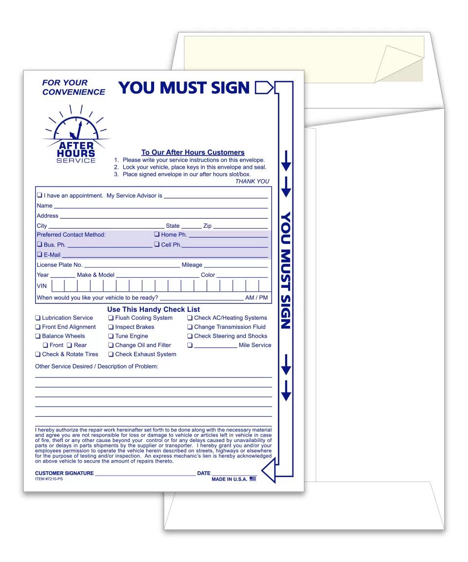 | After Hours Envelopes - Peel & Seal: Item #7210-PS Let your customers know that they can drop by, night or day with these 6" x 9", pre-printed, 24# white wove, peel and seal envelopes. This envelope is ready-made and geared to make sure that your customer provides everything you'll need to service their car, while ensuring that their keys remain secure when you can't be there to receive the information in person. Item #7210-PS: 6" x 9" - 24# White Wove - Peel & Seal Closure - 500 per box |