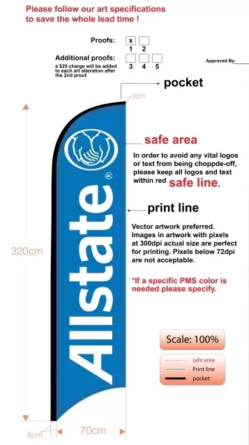 ALLSTATE custom feather flag. This feather flag has a vibrant colored background with bold graphics and text. Great for the front of a business or out by the road, this flag will flutter & flap with a slight breeze. This easy to install kit comes complete with an 11.5 ft flag, a 15ft flagpole, a carrying-case, and a mounting base of your choice. It can be set-up quickly in under 5 minutes. This flag measures approximately 2.5 feet wide by 11.5 feet tall. When installed on the flagpole it is nearly 15 feet tall.