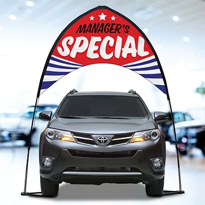 New Arch Banner Kit! Kit Includes: 4 Piece Pole Set w/ Carry Case, Arch Banner & Two Tire Bases Kit: 9 ft. 8" tall X 7 ft. 7" Wide Banner Only: 5 ft. tall X 6 ft. 9" wide Digitally Printed Available in: SALE, Car of the Week & Managers Special Indoor & Outdoor use Do Not Use in Windy Conditions
