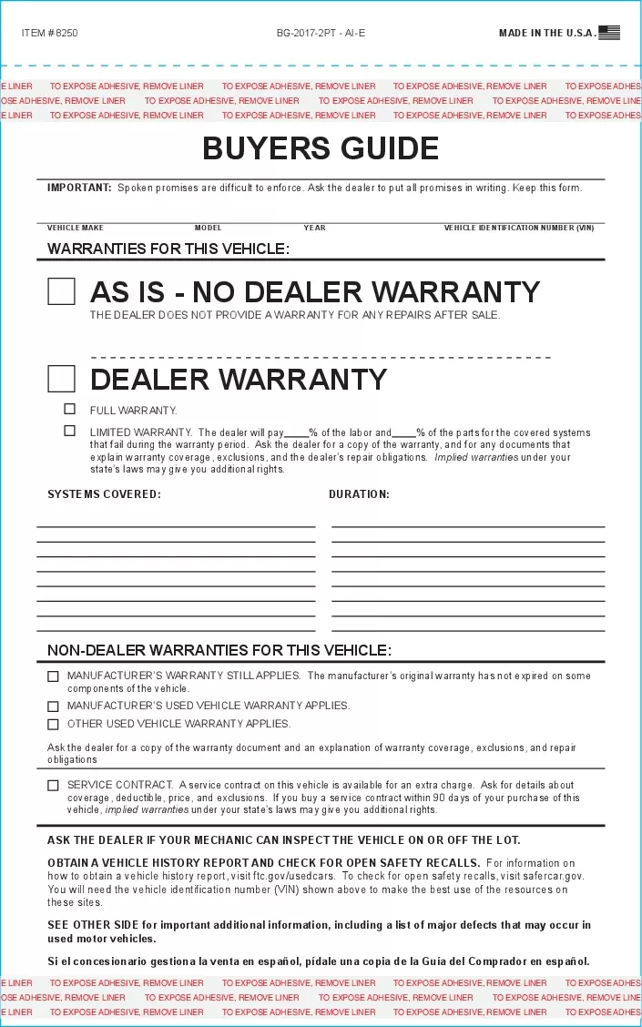 Buyers Guide As-is Form Revised for 2017 Required by law for consumer protection on used vehicles, this form meets federal regulations. Pressure sensitive tape at the top and bottom holds this 2-part carbonless, 8.5 wide x 11 tall form to the window. Sold in packs of 100. |