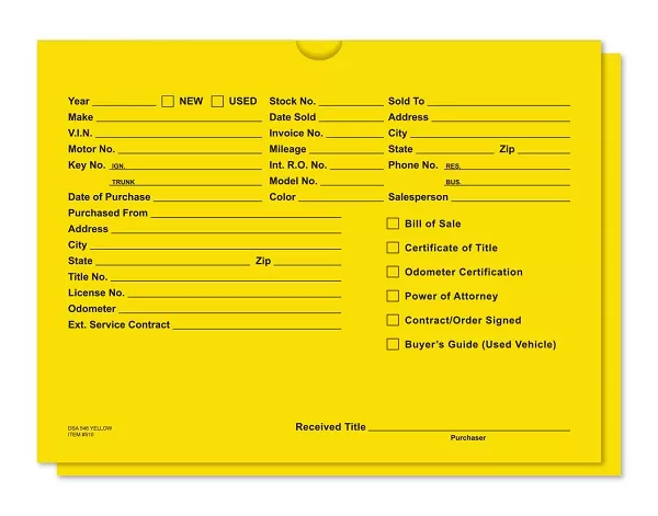 Use these handy 9`` x 12`` Deal Jackets for storing all of your vehicle`s important papers. Protect your vehicle`s records from becoming lost, torn or wrinkled. Sold in packs of 500 Available in 10 colors. See our other colors in our Auto Dealer Supplies category. The item being sold is one package of 500. Printed on 32lb stock paper
