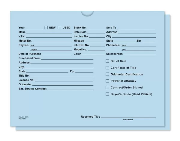 Use these handy 9`` x 12`` Deal Jackets for storing all of your vehicle`s important papers. Protect your vehicle`s records from becoming lost, torn or wrinkled. Sold in packs of 100 Available in 10 colors. See our other colors in our Auto Dealer Supplies category. The item being sold is one package of 100. Printed on 32lb stock paper