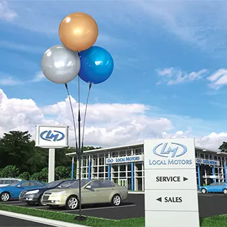 With your choice of three eye-catching reusable balloons, this kit is sure to draw attention from the sidewalk and the streets! The 3-Balloon Cluster Pole Kit is a lightweight and economical alternative to our top selling 5-Balloon Cluster. It stands at the same height of 8'6" and is made of the same weather-resistant plastic! Assembly is a snap as the brackets slide and pop into place and stems easily twist-lock into place. The staggered balloon look of this cluster bouquet is sure to grab the attention of passing traffic. The kit has everything you need, including: a 30" ground stake for landscape mounting, a Ground Plate to keep it securely above the ground surface, a thick 6061 aluminum cluster pole with snap-button locators and mounting brackets, 3 fiberglass stems and 3 Balloons. Pricing based on minimum order of 20 kits |