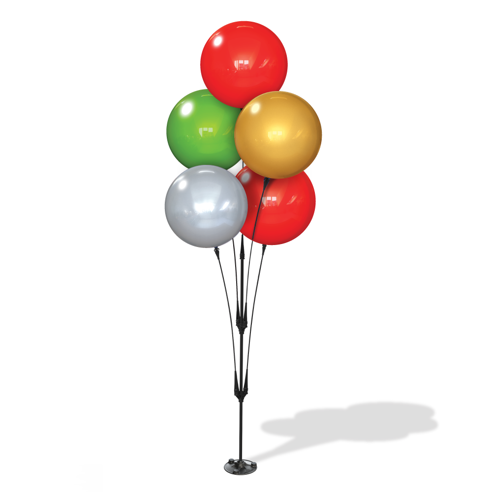The Cluster Pole Kit is perfect for BIG attention! It is a residential housing industry favorite! Assembly is a snap as the brackets slide and pop into place and stems easily twist-lock into place. The staggered balloon look of this cluster bouquet is sure to grab the attention of passing traffic. The kit has everything you need, including: a 30" ground stake for landscape mounting, a Ground Plate to keep it securely above the ground surface, a thick 6061 aluminum cluster pole with snap-button locators and mounting brackets, 5 fiberglass stems and 5 Balloons. This kit will ship with multi-color balloons (2-red, 1green 1gold, 1silver) |