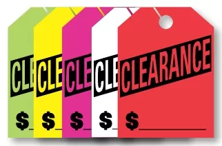 These Large Tags are 11.5" tall x 8.5" wide. Great for specials or week-end sales! Choose from 5 fluorescent colors: green, yellow, pink, red, & white Neatly shrink wrapped in packs of 50. Message reads CLEARANCE |