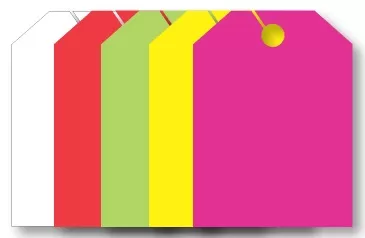 These Large Tags are 11.5" tall x 8.5" wide. Great for specials or week-end sales! Choose from 5 fluorescent colors: green, yellow, pink, red, & white Neatly shrink wrapped in packs of 50. Message reads BLANK