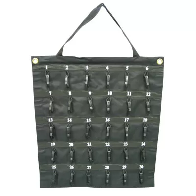 Newest Portable Key Storage Device on the Market! Flexible design allows the Key Case to quickly and easily roll up for compact storage in your safe or to take home. Made of durable, weather resistant, waterproof black vinyl, this case can hold 30 keys. Plastic safety hooks will not allow keys to accidentally fall off, will not pull off and will not puncture tires if driven over. Convenient handle for easy carrying and grommets at the top allow it to be hung for easy access during operating hours. Size: 23 1/2 inches wide x 29 1/2 inches tall. |