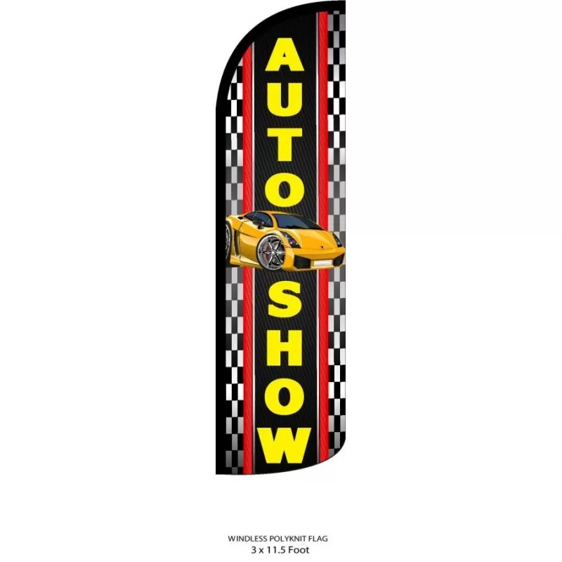 This Feather Flag, also called a Feather Banner, has a vibrant colored background with bold graphics and text. Great for the front of your business or out by the road, this flag will flutter & flap with a slight breeze. This flag measures approximately 2.5 feet wide by 11.5 feet tall. When installed on the flagpole it is nearly 15 feet tall. Constructed from UV treated, lightweight and affordable polyester. The printing on our flags is dyed-thru so the message is visible from both sides. It has a sewn sleeve that easily slips over the specially designed flagpole that is sold separately. To use this flag you will also need to purchase the flag hardware. Normal ground installation requires a flagpole and a ground-spike. These can be added to your order by clicking the 2 check-boxes above. You can also view these items in our Flagpoles-&-Hardware category. Purchase one of our feather banners today and get your business or event noticed!