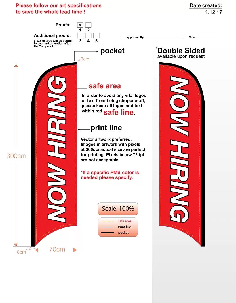 Home > Custom Flags Sold Examples > Custom Double-sided Med Now Hiring Feather Flag Kit Includes Flag, Flagpole, Ground-spike, & Carry-case
